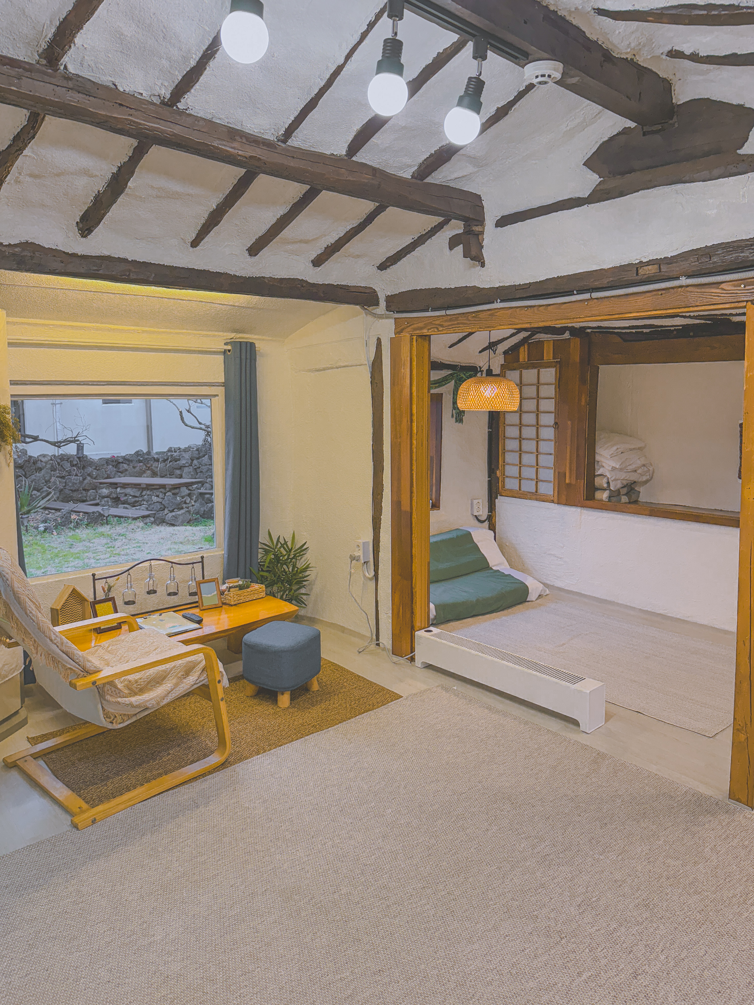 쪼바네 신촌점은 제주 전통 돌집을 리모델링해, 옛 제주의 정취와 세련된 편의성을 동시에 즐길 수 있는 공간입니다. 마당을 둘러싼 돌담, 따스한 햇살이 들어오는 창, 아늑한 구조는 여행객들에게 오래 기억될 휴식의 순간을 선사합니다.